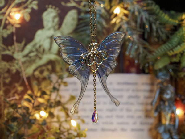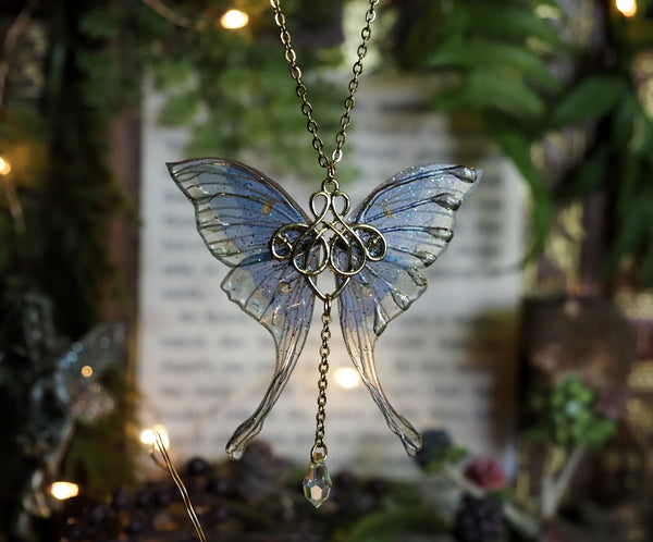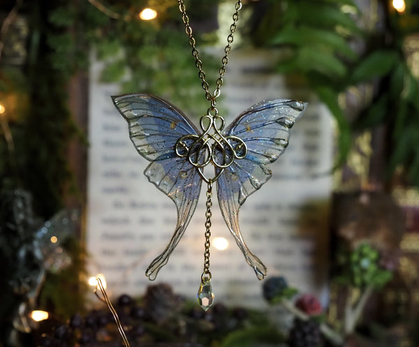 This enchanting necklace features a gilded pendant adorned with either two pairs of handcrafted fairy wings or one pair of handcrafted Luna Moth wings, beautifully layered in different sizes and colors, creating a whimsical, otherworldly look.