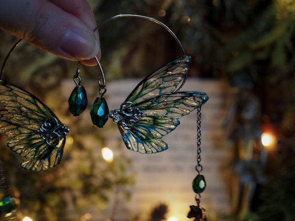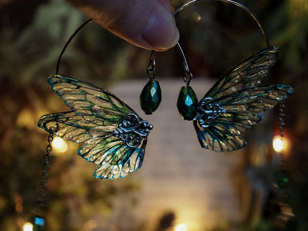 For enthusiasts of the fairy realm, these ear cuffs are a delightful accessory. Handmade from silvered copper wire, they evoke the whimsical spirit of fairyland with their handmade fairy wings, pearls, and tiny hanging accessory.