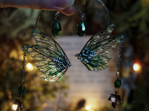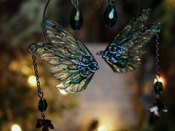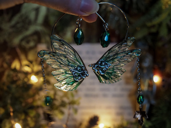 For enthusiasts of the fairy realm, these ear cuffs are a delightful accessory. Handmade from silvered copper wire, they evoke the whimsical spirit of fairyland with their handmade fairy wings, pearls, and tiny hanging accessory. Designed to be worn without ear piercings, they offer a charming and enchanting addition to any outfit. No ear piercings are required. These cuffs are designed to be slipped over the ear, providing a playful and enchanting accessory reminiscent of fairy accessories.