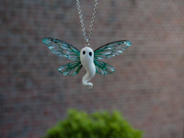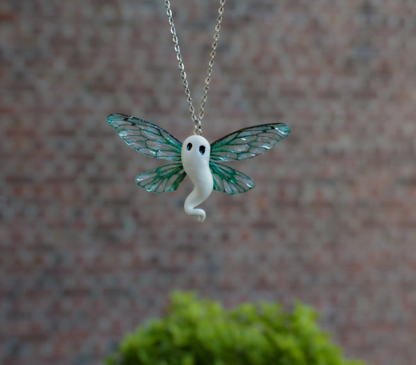 This charming handmade necklace features a delicate pairing of a miniature ghost and matching fairy wings, creating a whimsical balance of mystical and playful design. The pendant is paired with a stainless steel chain, available in either silver or gold tone, ensuring durability and elegance.