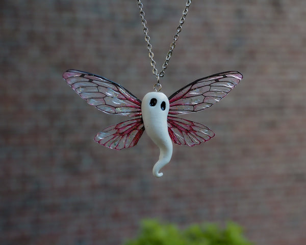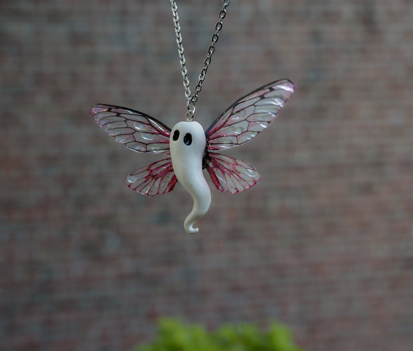 This charming handmade necklace features a delicate pairing of a miniature ghost and matching fairy wings, creating a whimsical balance of mystical and playful design. The pendant is paired with a stainless steel chain, available in either silver or gold tone, ensuring durability and elegance.