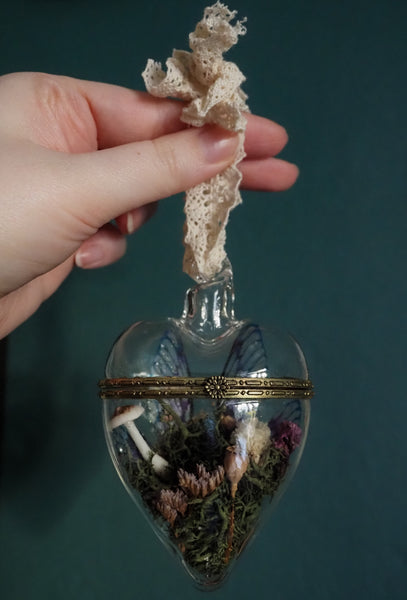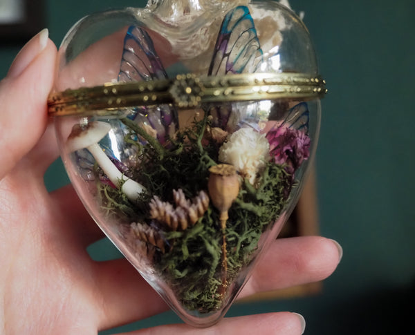 This heart-shaped glass container is an enchanting creation that shows a dreamy woodland scene, adorned with moss, dried flowers, and handcrafted fairy wings. Each element has been carefully selected to evoke a special atmosphere reminiscent of the cottagecore aesthetic. The woodland scene and dried flowers create a natural setting reminiscent of idyllic forest clearings and fairy tales. The container is intricately adorned with a ribbon, accentuating its romantic and playful aesthetic.