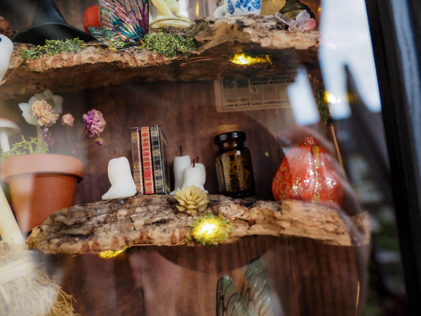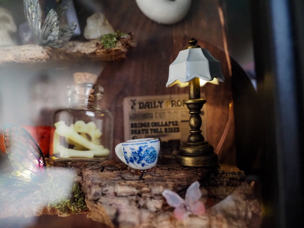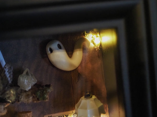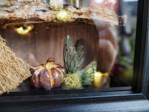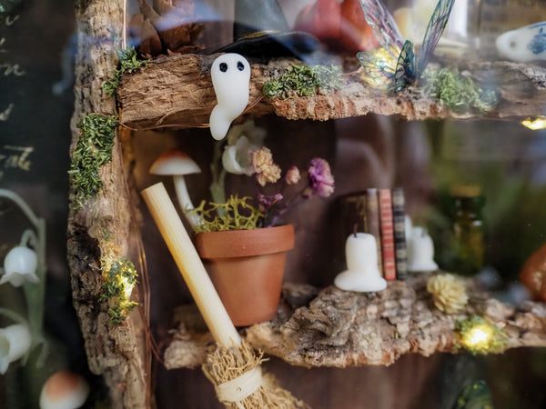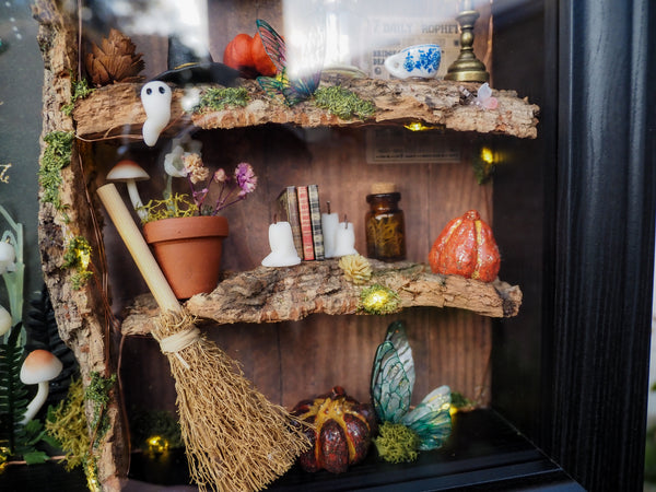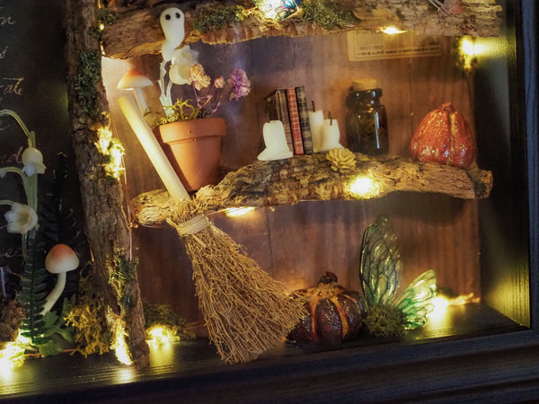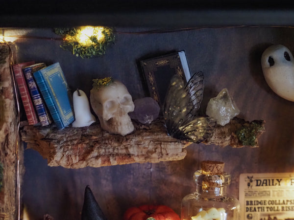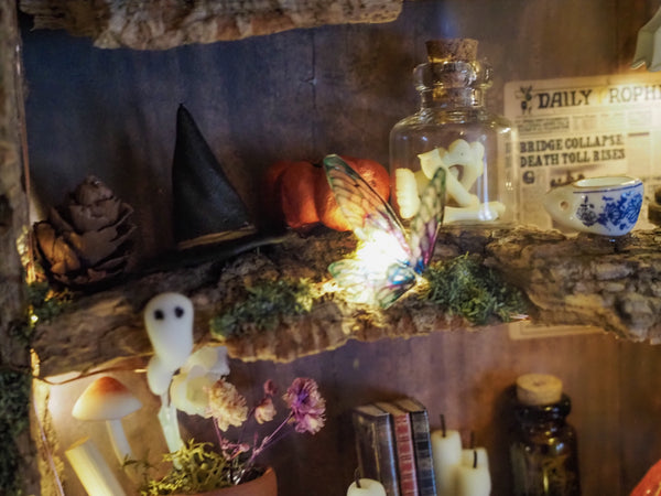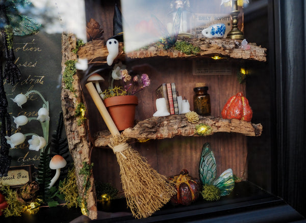 The frame includes a tiny glowing lamp, a miniature newspaper on the wall, sparkling pumpkins, a flower pot, handmade ghosts, candles, fairy wings and mushrooms—all arranged against a set of special fantasy-inspired backgrounds. Additional touches like artificial and hand-dried plants, glittering details, and miniature books make this piece a true one-of-a-kind creation.