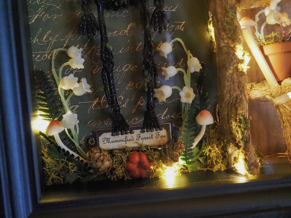 This enchanting one of a kind mummified faerie picture frame is transformed into a magical, spooky scene filled with unique handcrafted details. At its center stands a glittering skeleton with handmade fairy wings, surrounded by a miniature shelf made of tree bark that holds a collection of whimsical accessories.