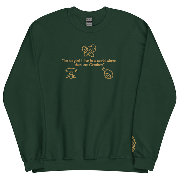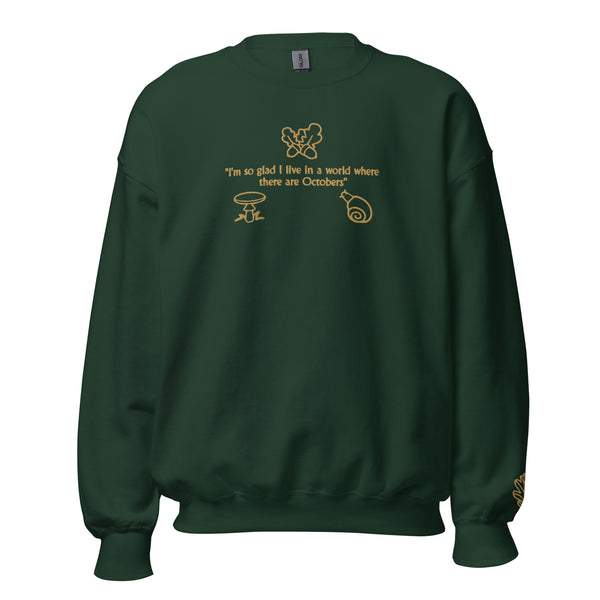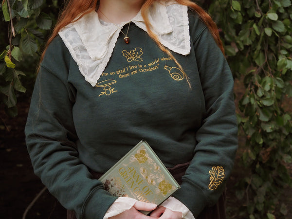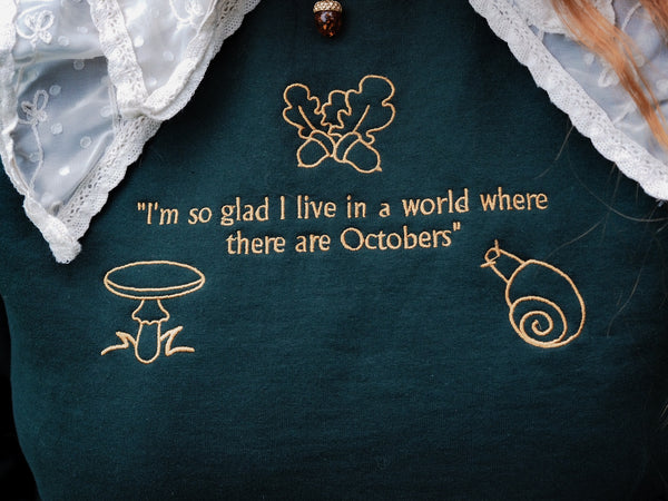 Celebrate the golden glow of the season with this cosy oversized sweater, lined with soft fleece for the dreamiest autumn comfort. Embroidered with delicate fall embroidery and a single leaf on the sleeve, it carries the timeless quote from Anne of Green Gables: “I’m so glad I live in a world where there are Octobers.” Perfect for crisp walks, pumpkin-scented evenings, and curling up with a book, this sweater is a love letter to autumn itself, charming, snug, and endlessly wearable.
