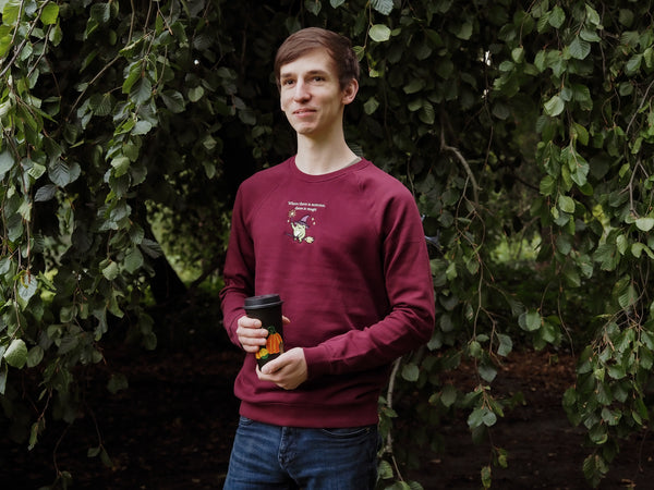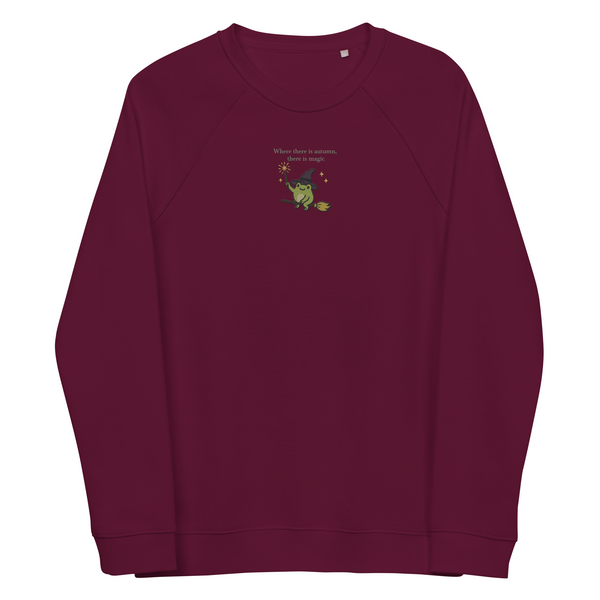 When autumn drapes the world in golden light and whispers of enchantment, this sweater becomes your cosiest spell. Made of soft organic cotton with a fleeced lining, it wraps you in warmth as the days grow crisp. Across the front, a tiny frog on a broom, witch hat tipped just so, takes flight, trailed by sparkling embroidered magic. Beneath, the words in green embroidery “Where there is autumn, there is magic” remind you that every falling leaf holds a story. A dreamy companion for misty mornings, candlelit evenings, and all the witchy wonders of the season. Its brushed fleece lining will make you feel like you’re being hugged by a cloud of softness