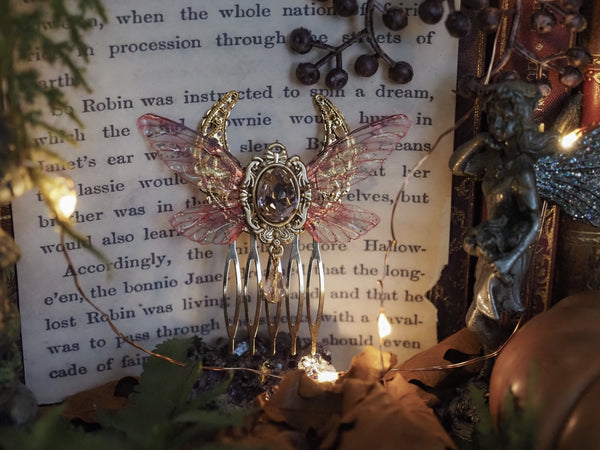 Introducing my lovely Enchanting Fairy Hair Comb, a whimsical adornment crafted with handmade fairy wings, a delicate moon accessory, a sparkling glass stone, and a matching teardrop pearl. This versatile accessory is perfect for any occasion, adding a touch of magic and elegance to your ensemble. Whether worn for a special event or to elevate your everyday look, let your inner fairy shine with this enchanting hair comb.