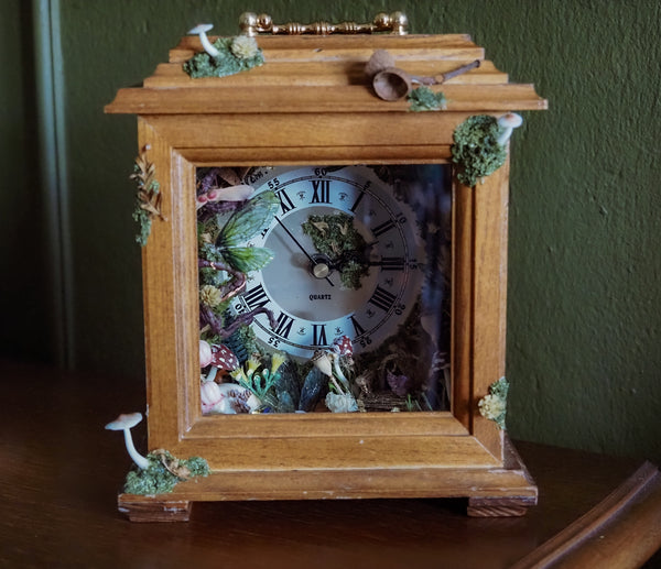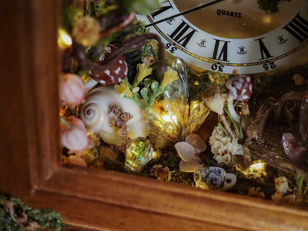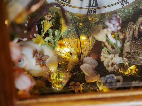 Explore my truly magical one-of-a-kind faerie clock, created from a vintage clock with a wooden frame and glass front and a golden mental handle which I lovingly transformed into a unique faerie realm. This enchanted piece blends nostalgia with fantasy and is rich in tiny, magical details.