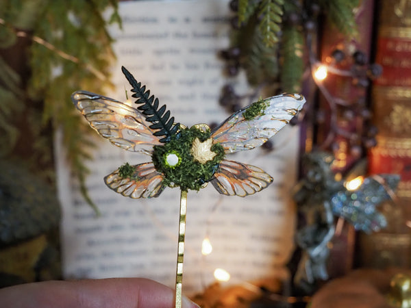 This enchanting handmade hairpin is a unique statement piece, featuring delicate fairy wings as its central detail. Carefully crafted with a touch of nature, it includes dried fern elements, moss and is adorned with whimsical accents such citrin, pearls, glass stones, metalic ornaments or miniature mushrooms.
