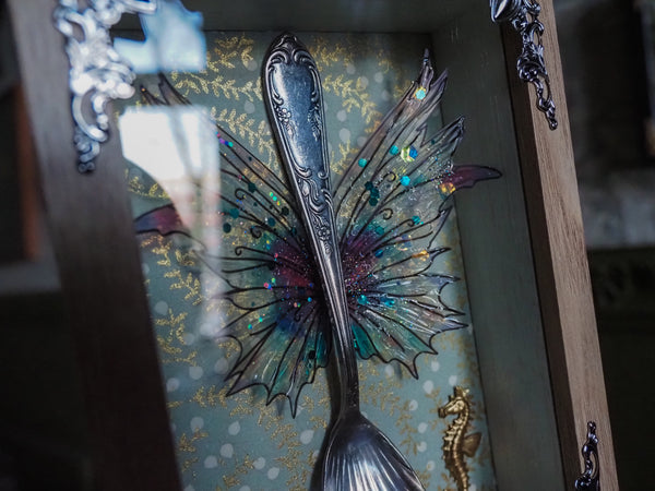 This exquisite handmade one of a kind piece features an antique look that adds a touch of vintage elegance to any space. The frame is adorned with a delicate winged antique silver spoon, symbolizing the fairies' gentle touch, and is set against a backdrop which shows a magical scenery with golden elements. Small golden ornaments adding a shimmer to this extraordinary piece that complements its ethereal theme. Perfect for those who cherish fantasy and timeless beauty, this frame is a magical addition to your decor.